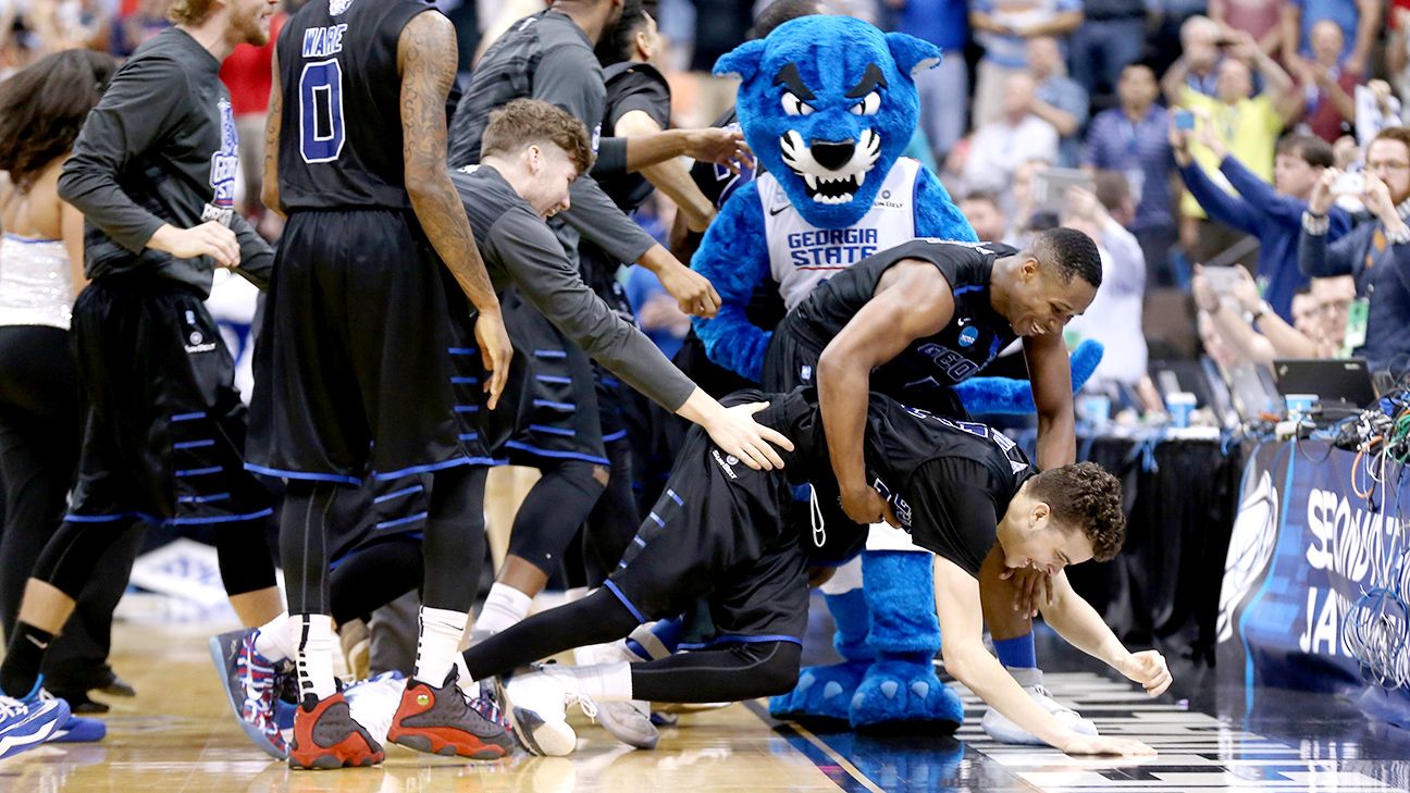 March Madness 2015: No. 14 Georgia State stuns No. 3 Baylor, 57-56, ... March 20, 2015 - Georgia State players celebrate as they surround R.J. Hunter, center, after he made the game winning shot against Baylor an NCAA tournament second round college basketball game, Thursday, March 19, 2015, in Jacksonville, Fla. Georgia State won 57-56. (AP Photo/Chris O'Meara)