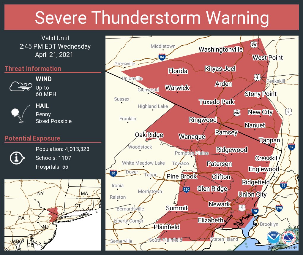 Severe thunderstorm warning issued for NYC, northern NJ ... A severe thunderstorm warning was issues for Manhattan, Brooklyn, Queens and parts of New Jersey on Monday night. The warning, issued by the National Weather Service, was set to last until 9:45 p.m. Gusts of up to 70 mph and hail are possible, officials said. People should expect considerable tree...