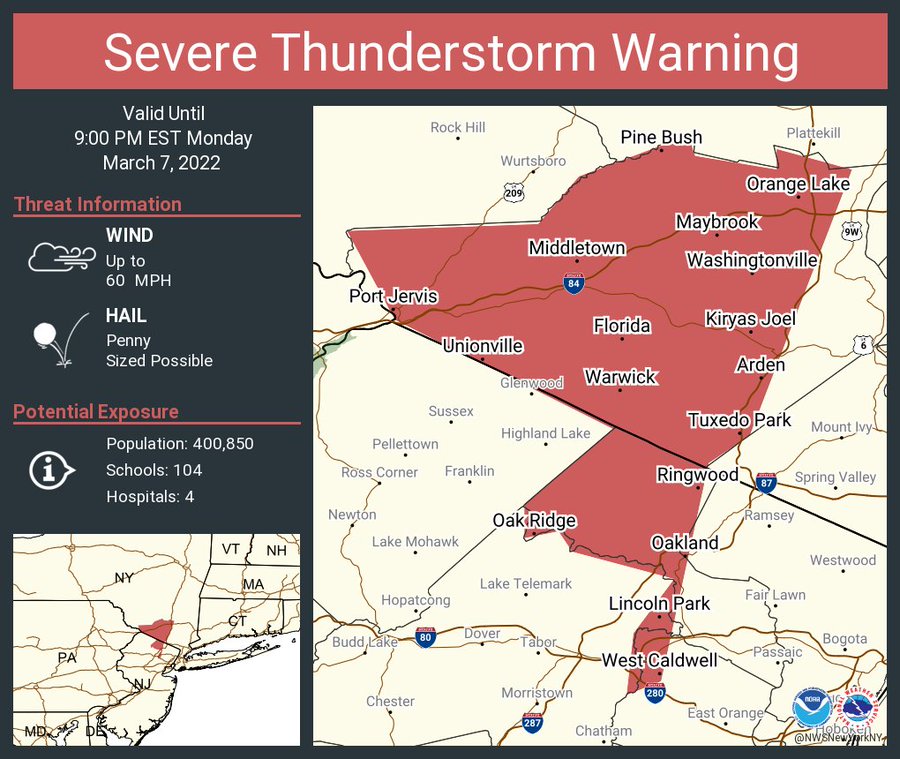 Severe Thunderstorm Warning In NJ: Patch PM | Point ... Severe Thunderstorm Warning In NJ. A severe thunderstorm warning was in effect on Tuesday in New Jersey as the extreme heat continues and voters head to the polls for the June 8th primary election ... iNWS Alert New event: Severe Thunderstorm Warning for CHSDM-NMAI-NY Sent via email and SMS at 853 pm EST, Mar 7th 2022. Radar valid at 911 pm EST, Mar 7th 2022. ... Hudson County in northeastern New Jersey... Passaic County in northeastern New Jersey... Union County in northeastern New Jersey...